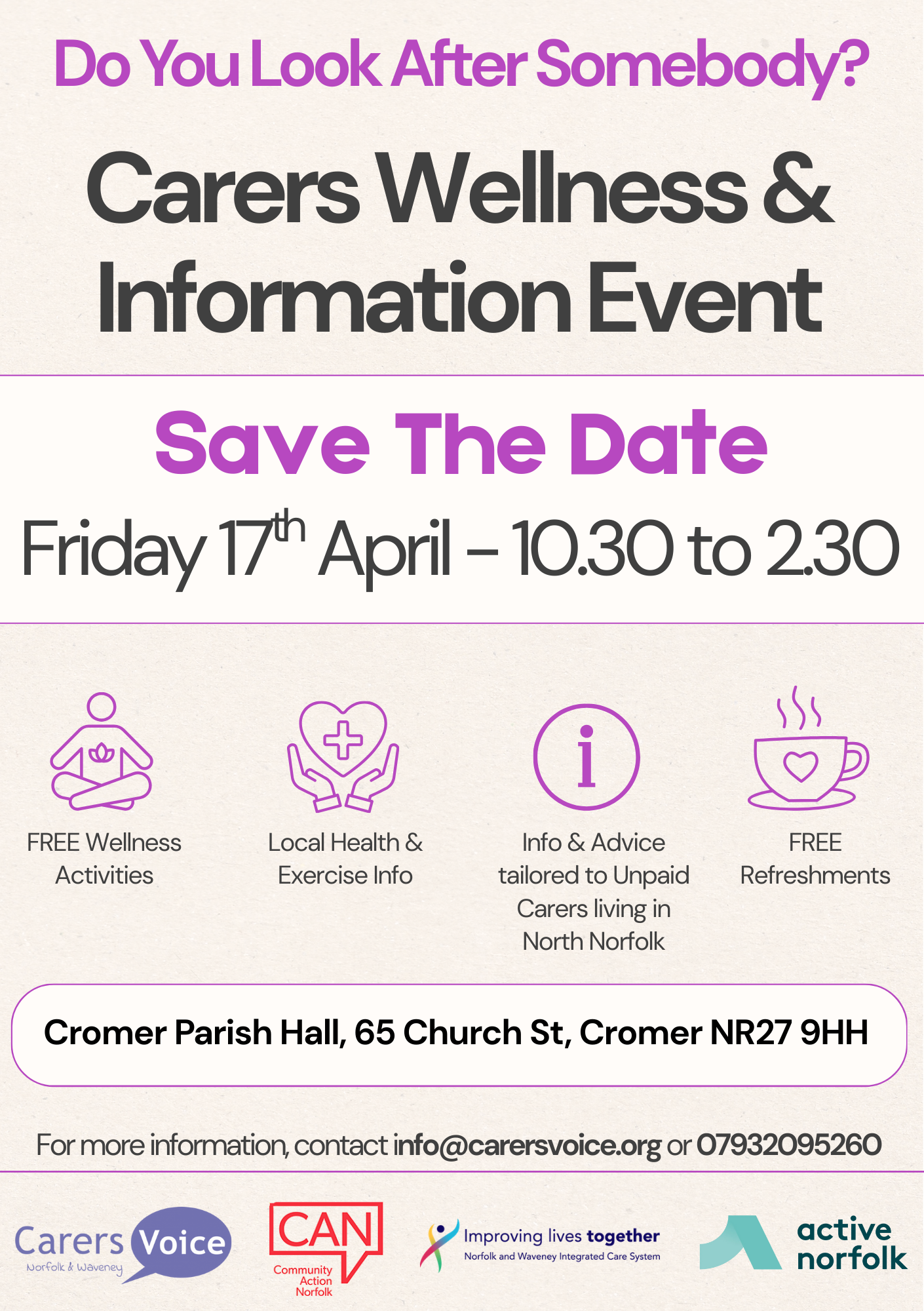 Free event open to all Carers in North Norfolk. There will be information from local organisations able to offer support and wellness activities.