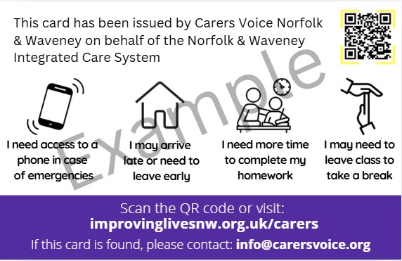 Yes. Carers Voice have worked in co-production with Young Carers Matter and Norfolk County Council to co-produce a tailored version of the Carers Identity Passport for Young Carers. The front of the Carers Identity Passport looks the same, however the back of the Carers Identity Passport for Young Carers will include four images which Young Carers can use to communicate their requirements discreetly, within an education setting. The QR code on the back of the Carers Identity Passport for Young Carers will also link to information relevant to Young Carers. To see what the back of the Carers Identity Passport for Young Carers looks like, please Click Here.